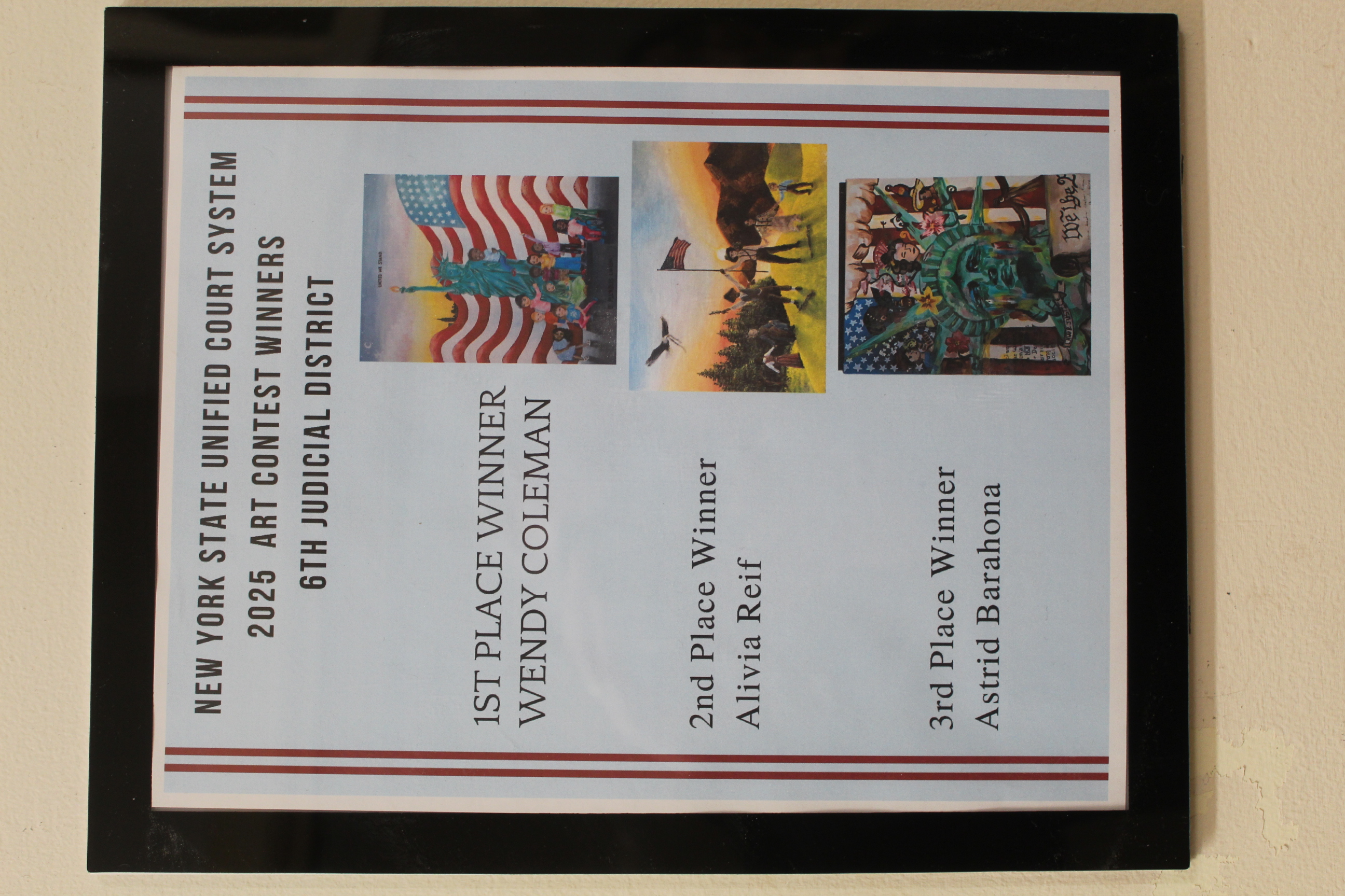 As part of the recognition, the winning artwork will also be displayed in courthouses across the ten counties that make up New York’s 6th Judicial District, allowing community members throughout the region to view the students’ work.