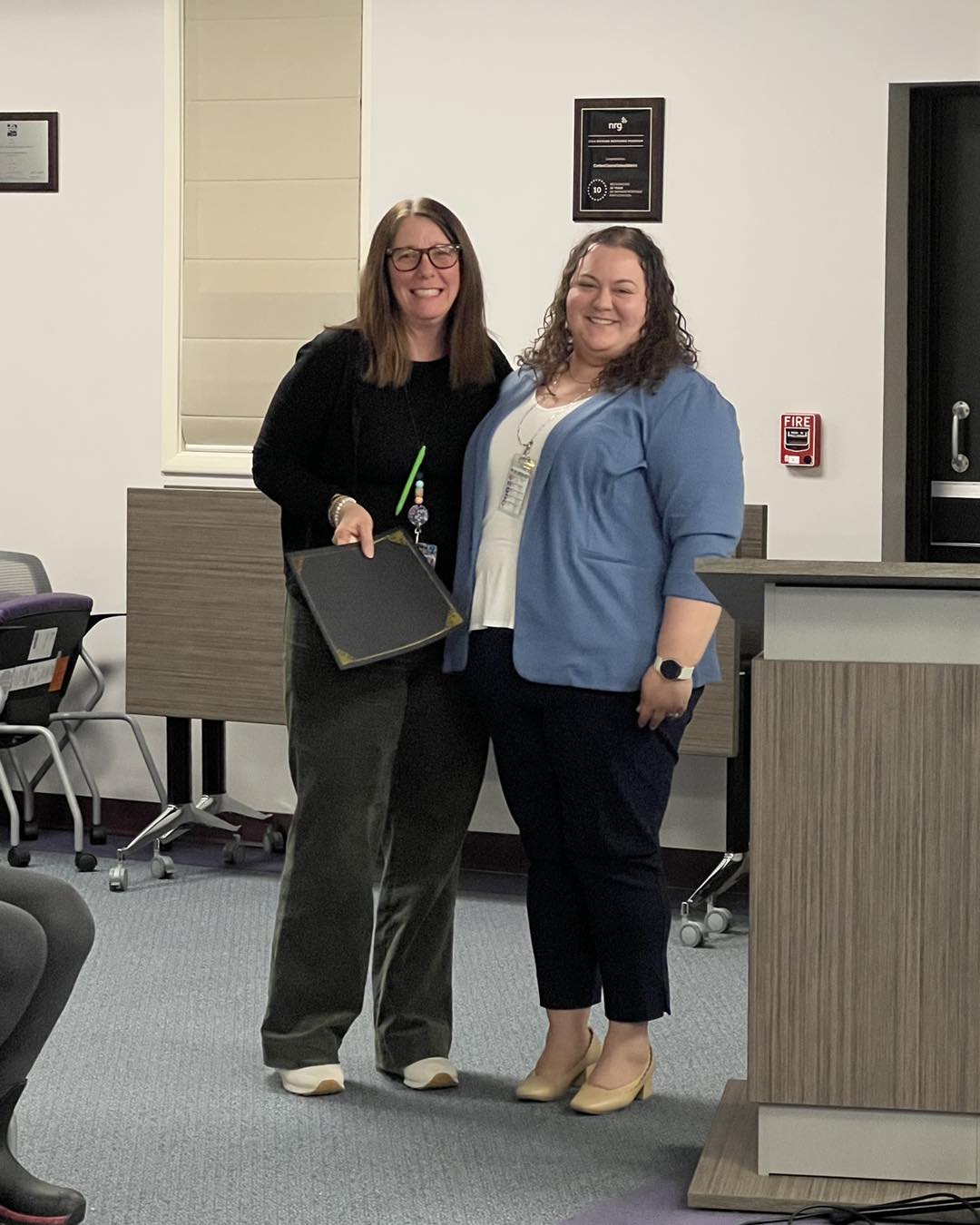 Amy Worlock with a Tiger Paw Award in recognition of her acceptance into the New York State Master Teacher Program.