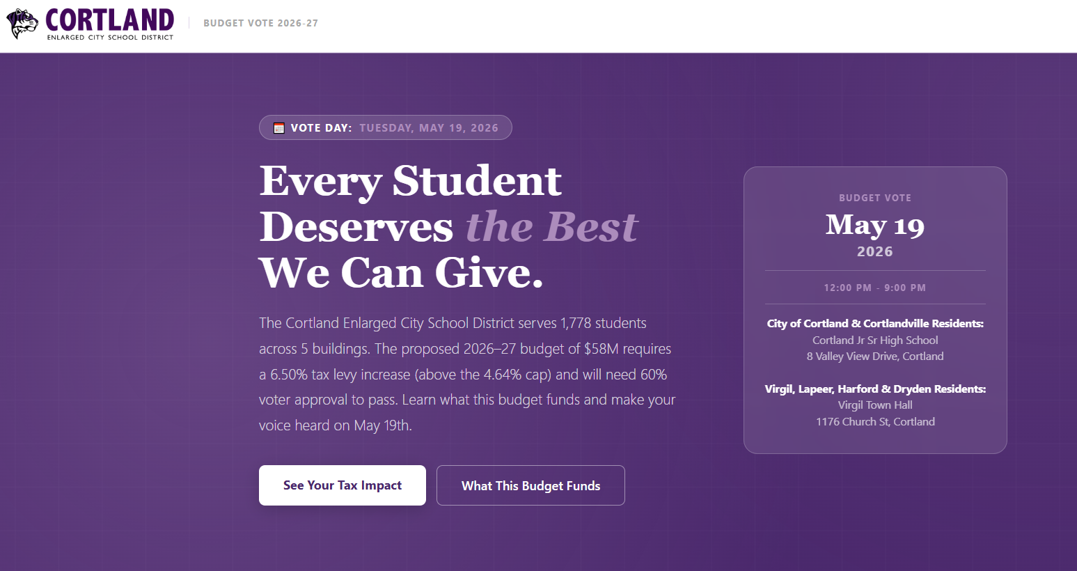 The Cortland Enlarged City School District has unveiled a centralized online budget resource designed to provide residents with clear, accessible, and up-to-date information about district finances and the annual budget process.